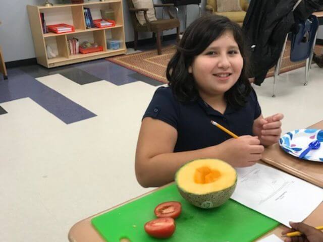 Our fifth grade class is currently studying plant structures and processes. As to learn more about the reproduction of flowering plants, they cut open a cantaloupe, tomato, orange, apple, and avocado. They then inspected their enlarged ovaries (fruits) with seeds, cut the seeds open, and inspected the seed fragments under a microscope. The students noted their knowledge, questions and observations on a “Know, Wonder, Learn” (KWL) chart. The fifth grade class has also planted some seeds and are inspecting them over time.